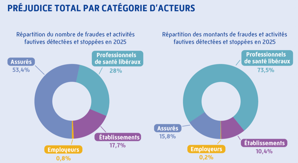 Bien que plus de la moitié (53%) des fraudes soient commises par les assurés, notamment via des arrêtes de travail ou des fraudes aux droits, elles ne concentrent que 16 % des montants seulement, "soit environ 115 M€". À l’inverse, celles commises par des professionnels de santé libéraux "dont les centres de santé concentrent près de 3/4 des montants pour 28 % des cas", regrette l'Assurance maladie. "Certains acteurs totalisent à eux seuls des montants particulièrement élevésnotamment les centres de santé (138 M€)". Dans ce montant, la moitié du préjudice (68,9 M€) a toutefois "pu être stoppé avant paiement". Ces "professionnels" surfacturent des soins voire en inventent, avec des techniques qui empruntent de plus en plus fréquemment aux réseaux de criminalité organisée. "Une partie des montants les plus significatifs provient d’acteurs qui ne sont pas issus du monde de la santé et qui exploitent le système de santé à des fins financières, avec des stratégies de fraudes délibérées et systématisées à grande échelle", révèle l'Assurance maladie.