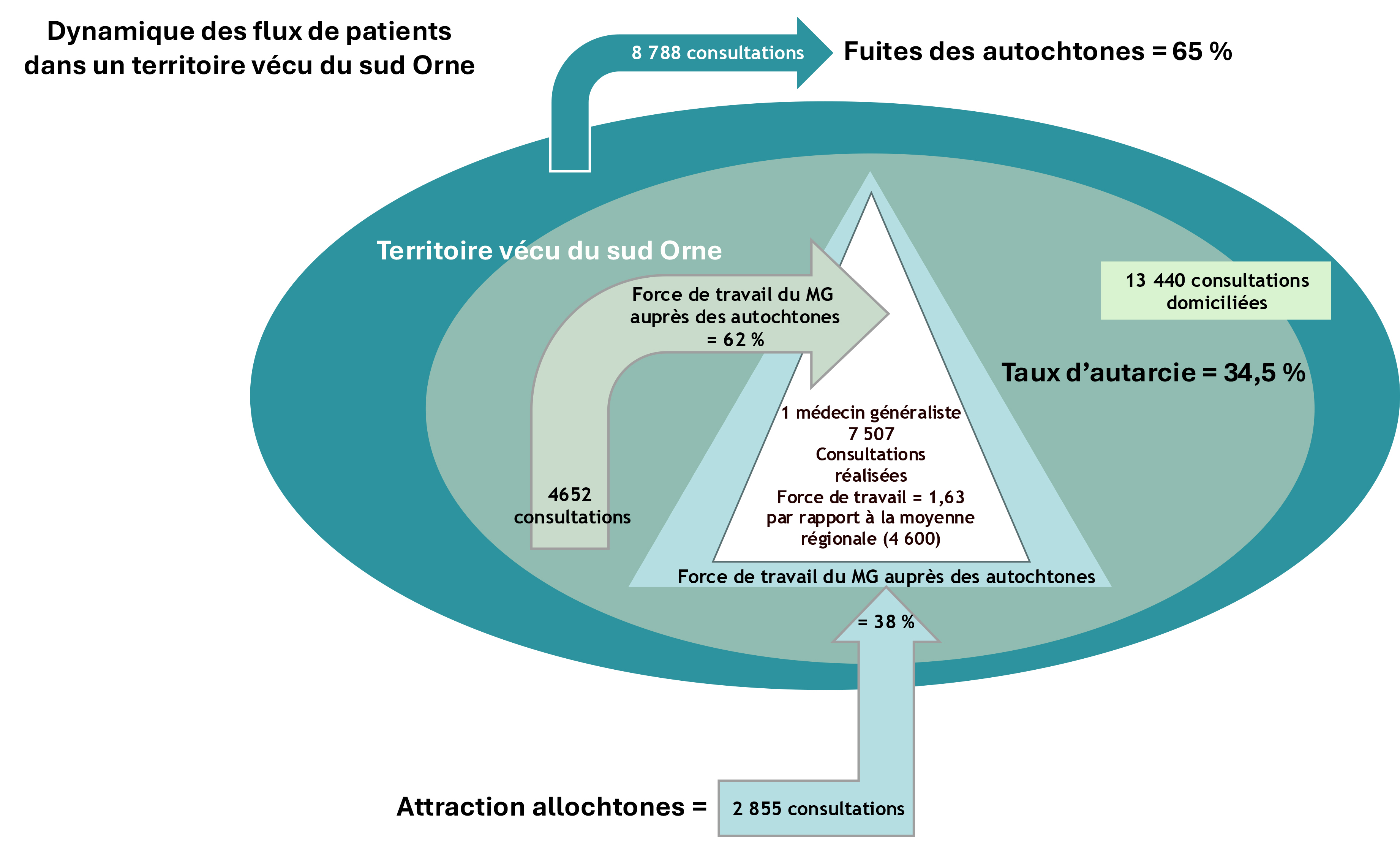 L’espace correctement cadré nous permet, par la suite, une analyse plus approfondie de ce territoire. Prenons le territoire vécu du sud Orne (voir image 1) : on voit qu’il y a un seul médecin, qu’il réalise 7 507 consultations par an, et donc on va analyser les données. Comment travaille-t-il ? D’où viennent ses patients ? Il y a un taux d’autarcie de 34,5 %, c’est-à-dire que 34,5 % de patients domiciliés consultent à l’intérieur de ce territoire et donc auprès de ce médecin. Mais celui-ci ne peut pas recevoir tous les patients et on constate que 65 % des patients domiciliés dans le territoire de ce médecin vont chercher des solutions ailleurs. Donc 8 788 personnes sortent du territoire pour chercher de l’aide médicale. 65 %, c’est énorme ! Le problème, c’est que ce professionnel ne pourra pas en faire plus. Il a une force de travail beaucoup plus importante que la moyenne nationale, voire régionale, puisqu’un médecin en France réalise environ 4 250 consultations par an. Ainsi ce médecin réalise le volume de consultations avoisinant presque le travail de deux médecins...