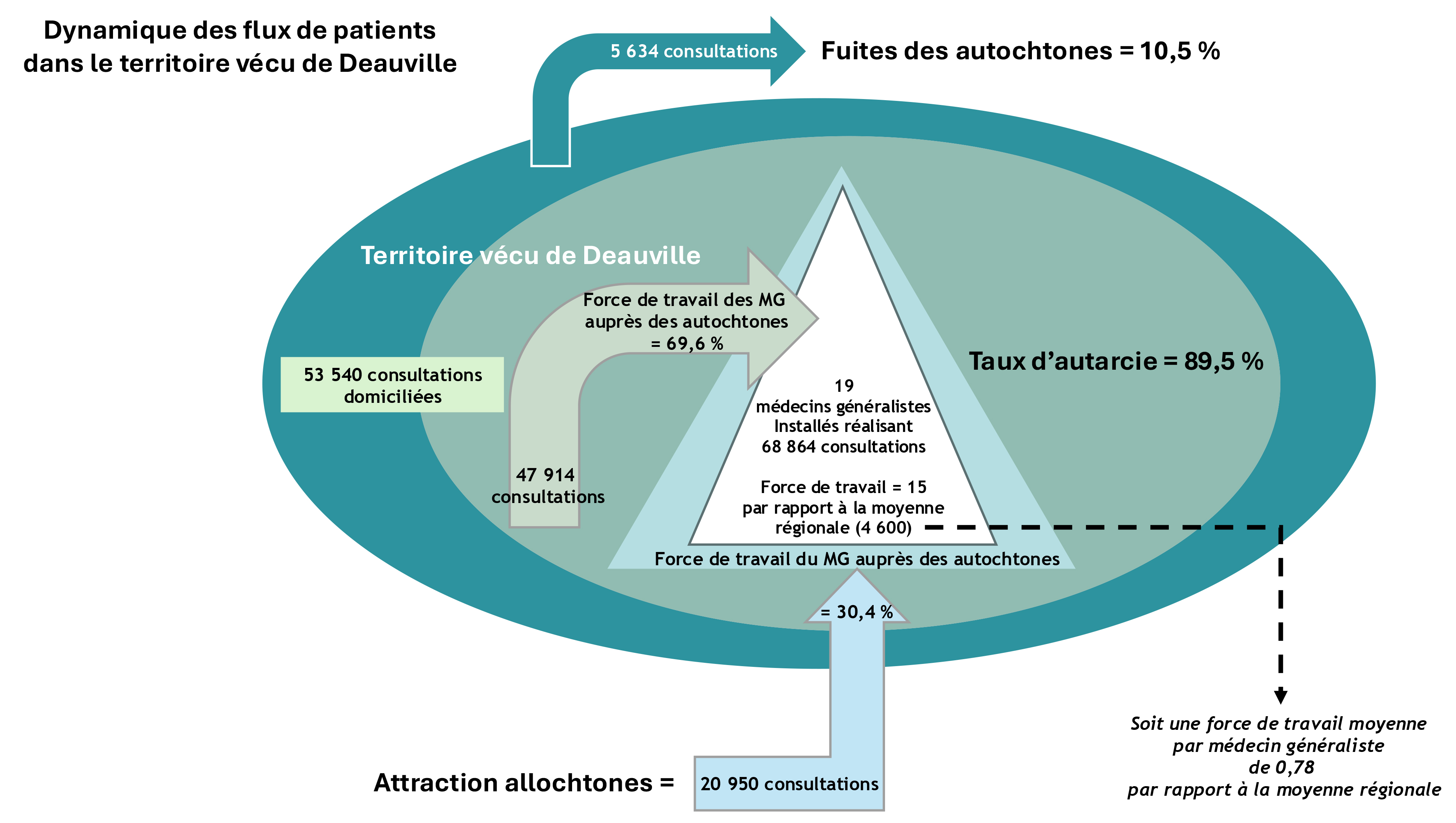 Le territoire vécu, lui, reflète la pratique spatiale des usagers sur une "thématique spécifique" (recours à un médecin généraliste, ou à un spécialiste, à un paramédical, etc.). Ce qu’on a présenté au colloque SanteXpérience, ce sont les métrages et les mécaniques en Normandie. Donc quand on parle de "territoire vécu", on parle de territoire vécu du point de vue d’une spécialité, d’un métier : le territoire vécu de médecins généralistes, de pharmaciens, d’infirmières libérales, etc. Prenons la chirurgie, par exemple, pour laquelle on aura des territoires vécus en fonction de la branche orthopédique, urologique, etc. Donc il faut recadrer à chaque fois ces territoires pour cibler correctement l’espace.